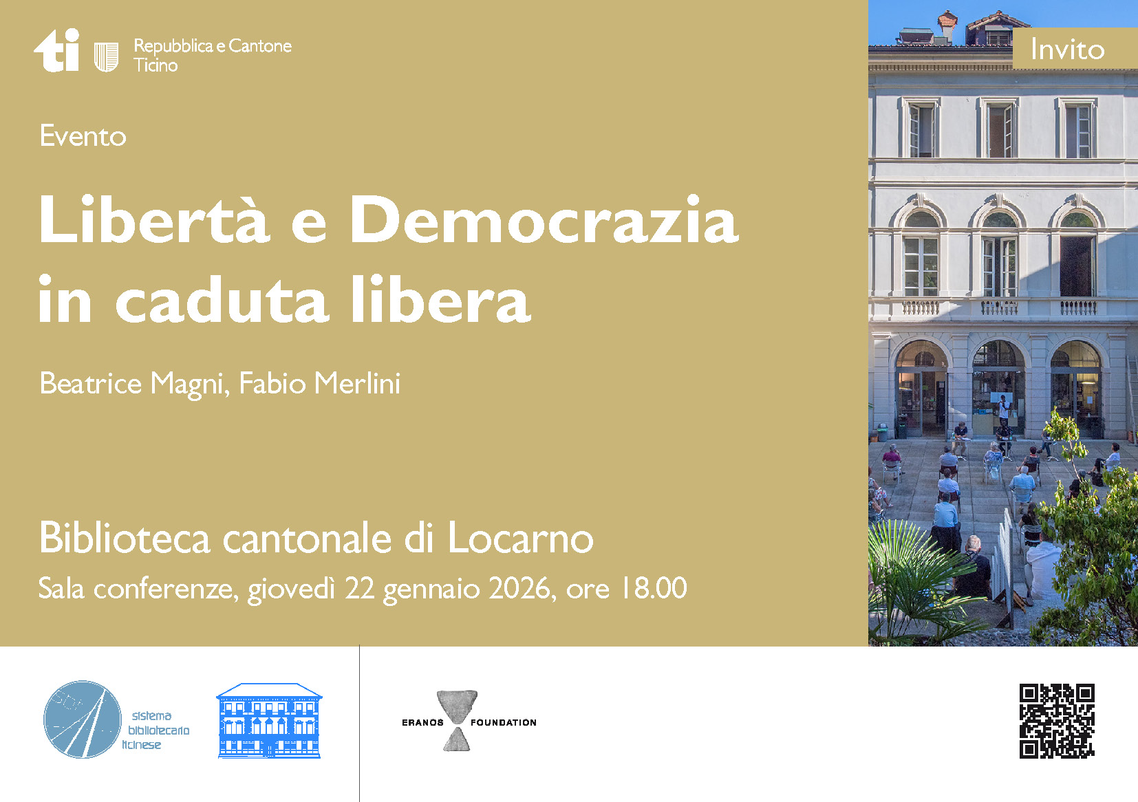 The Eranos Foundation is pleased to invite you to a conference on the theme of ‘Freedom and democracy in free fall’, organised in collaboration with the Cantonal Library of Locarno, on Thursday, January 22, 2026, at 6 p.m., in the lecture hall of the Cantonal Library of Locarno.